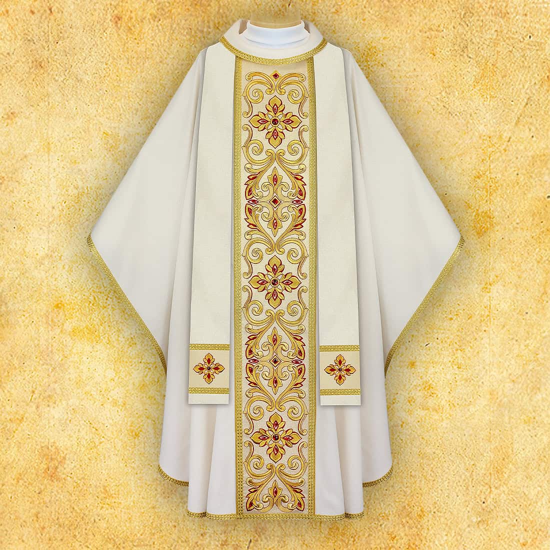 The central embroidered cross motif has been additionally decorated with decorative stones, which give the chasuble a unique shine and emphasize its dignified character. The embroidery is visible on both the front and back, creating a coherent, elegant composition. The set includes an inner stole in a matching color.gt;The set includes a inner stole in a matching color.