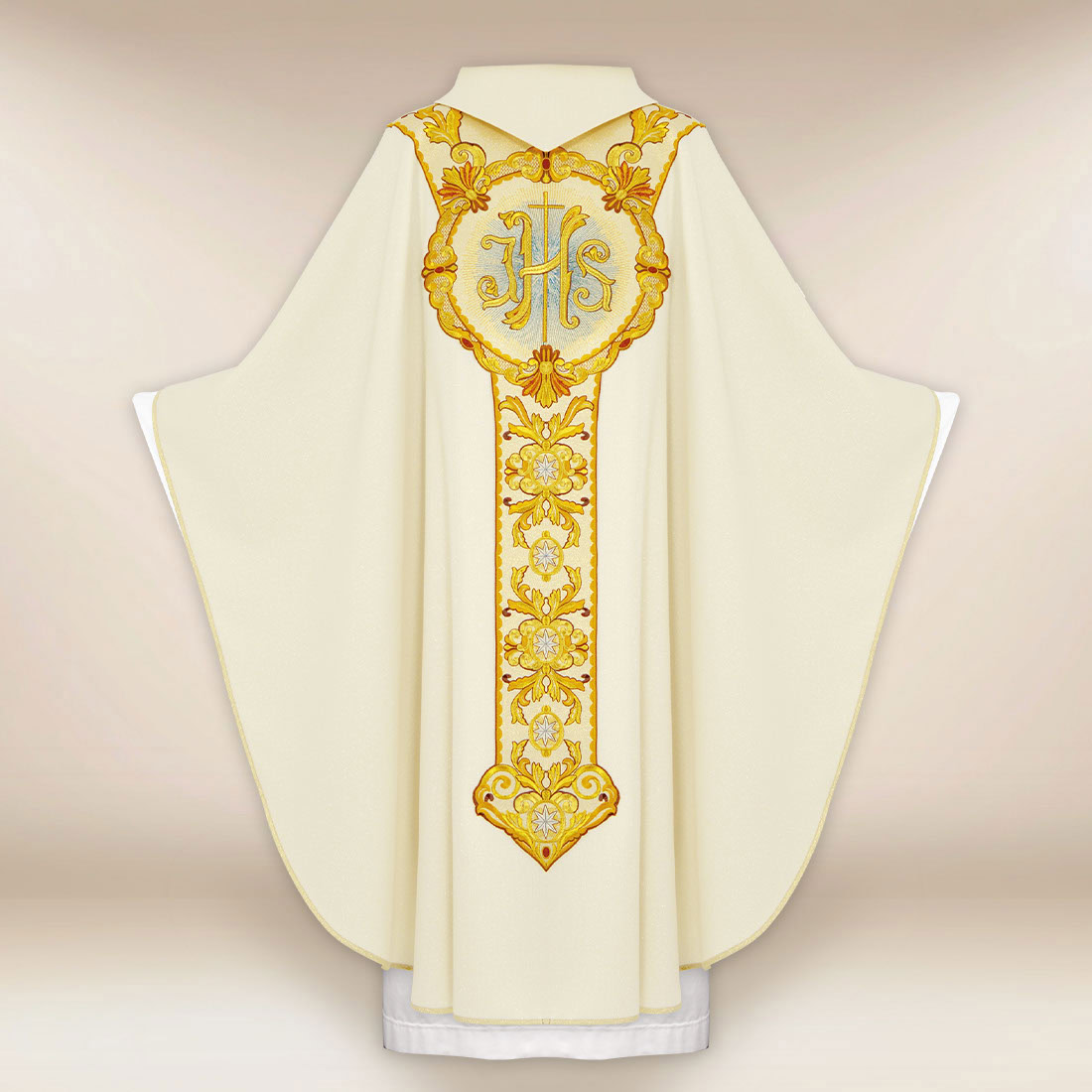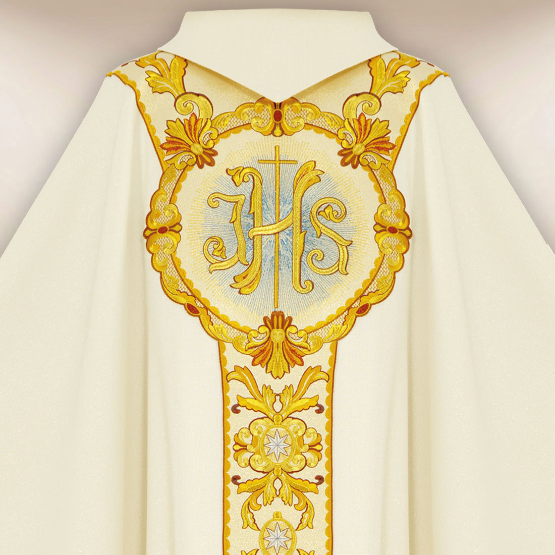 The central element of the decoration is the image of the Infant Jesus resting on hay, depicted in delicate, classical iconography. It is surrounded by a rich composition of ornaments inspired by sacred art, creating a harmonious structure that subtly guides the gaze towards the light emanating from the Bethlehem scene. At the back of the chasuble, there is an intricately embroidered IHS monogram, framed in a decorative design with a Christmas style.