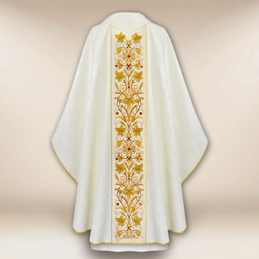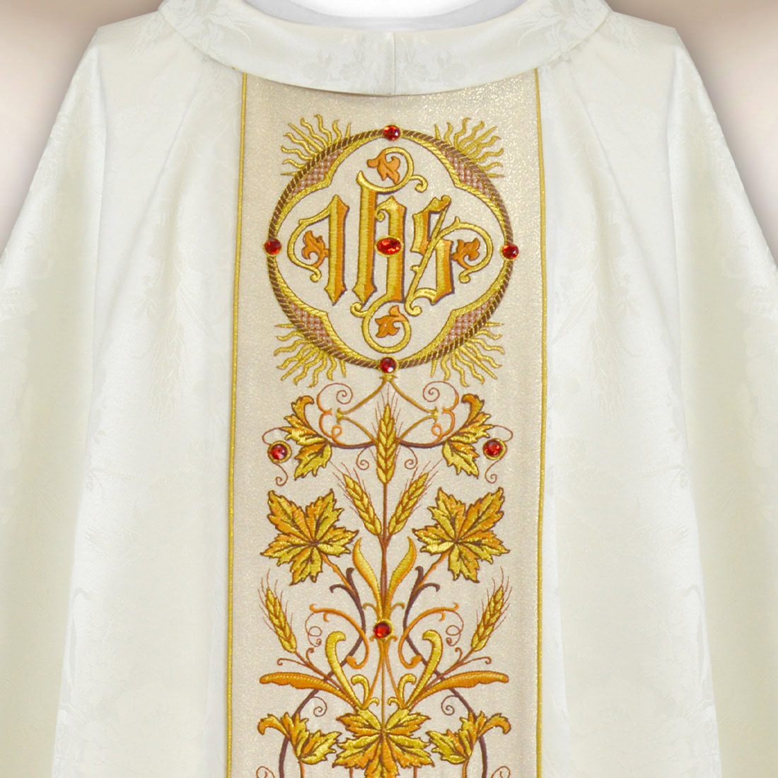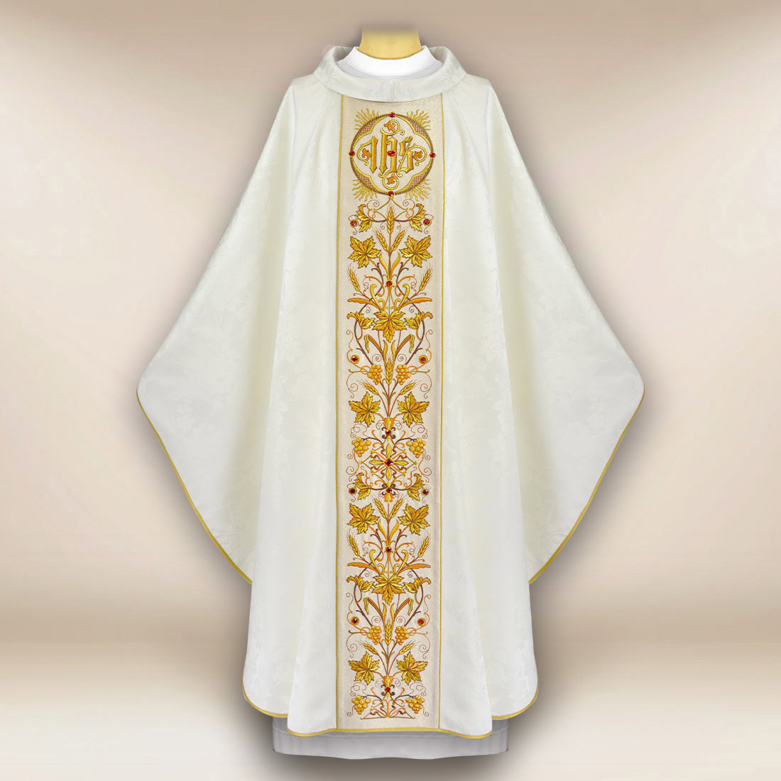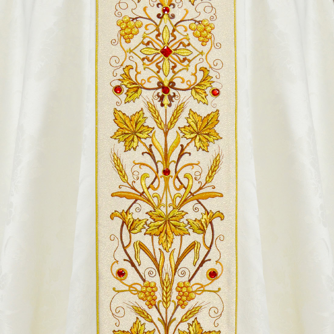 Urbanowicz Haft Polska presents a cream jacquard embroidered chasuble, designed as a liturgical garment of exceptional elegance, intended for solemn celebrations, church feasts, and liturgies of particularly elevated character. Made from high-quality jacquard fabric, it features a subtle floral pattern, where delicate motifs of roses, wheat ears, grapes, and leaves create a harmonious, balanced composition with clear sacred symbolism.