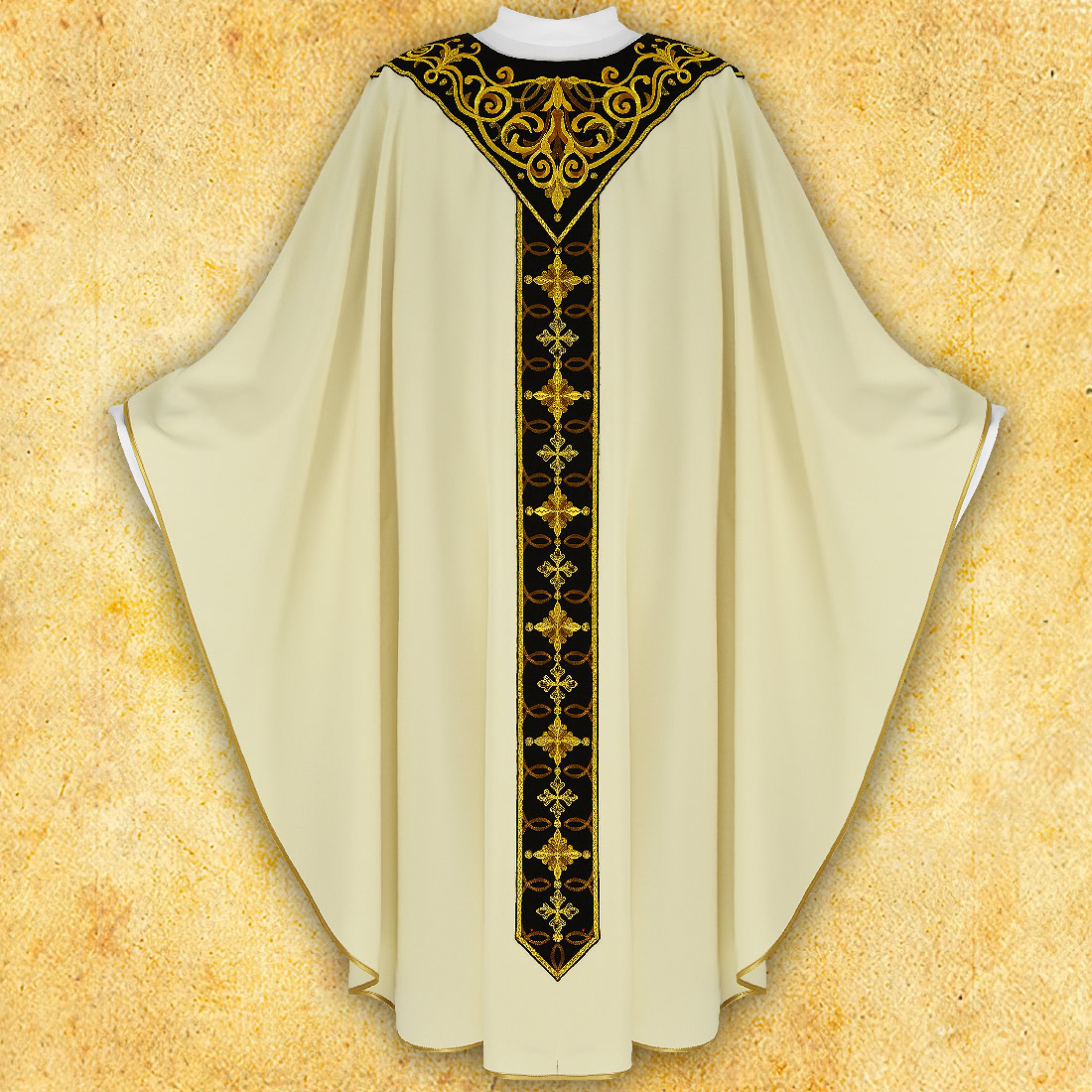 An elegant ecru-colored vestment with an embroidered black belt, perfect for funeral ceremonies and memorial masses. />Made of high-quality “Satinowool” fabric, which combines softness, delicacy, and excellent drape.