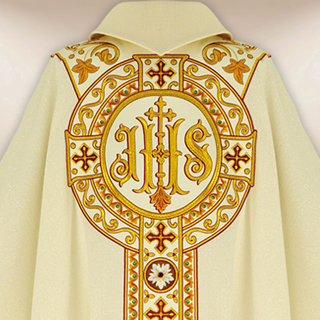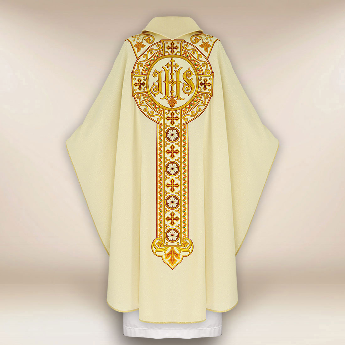 Material Sacroline, from which the chasuble is made, is an elegant blend of viscose, linen, and silk, complemented by a small addition of polyester. This makes the vestment light, breathable, pleasant to the touch, and resistant to creasing. The subtle interweaving of gold thread gives the fabric nobility and enhances its liturgical character. The chasuble has been meticulously sewn to maintain perfect draping even during longer celebrations.