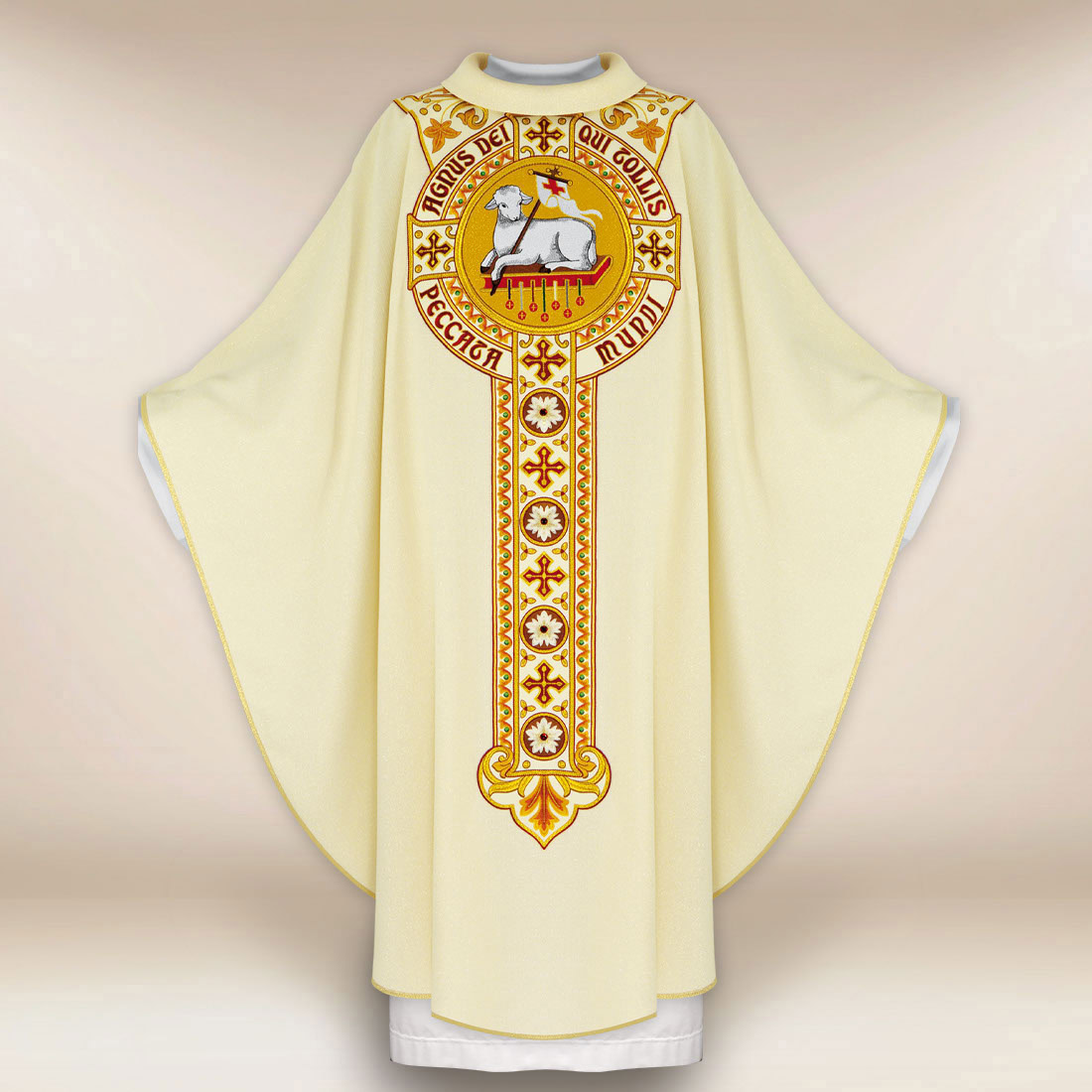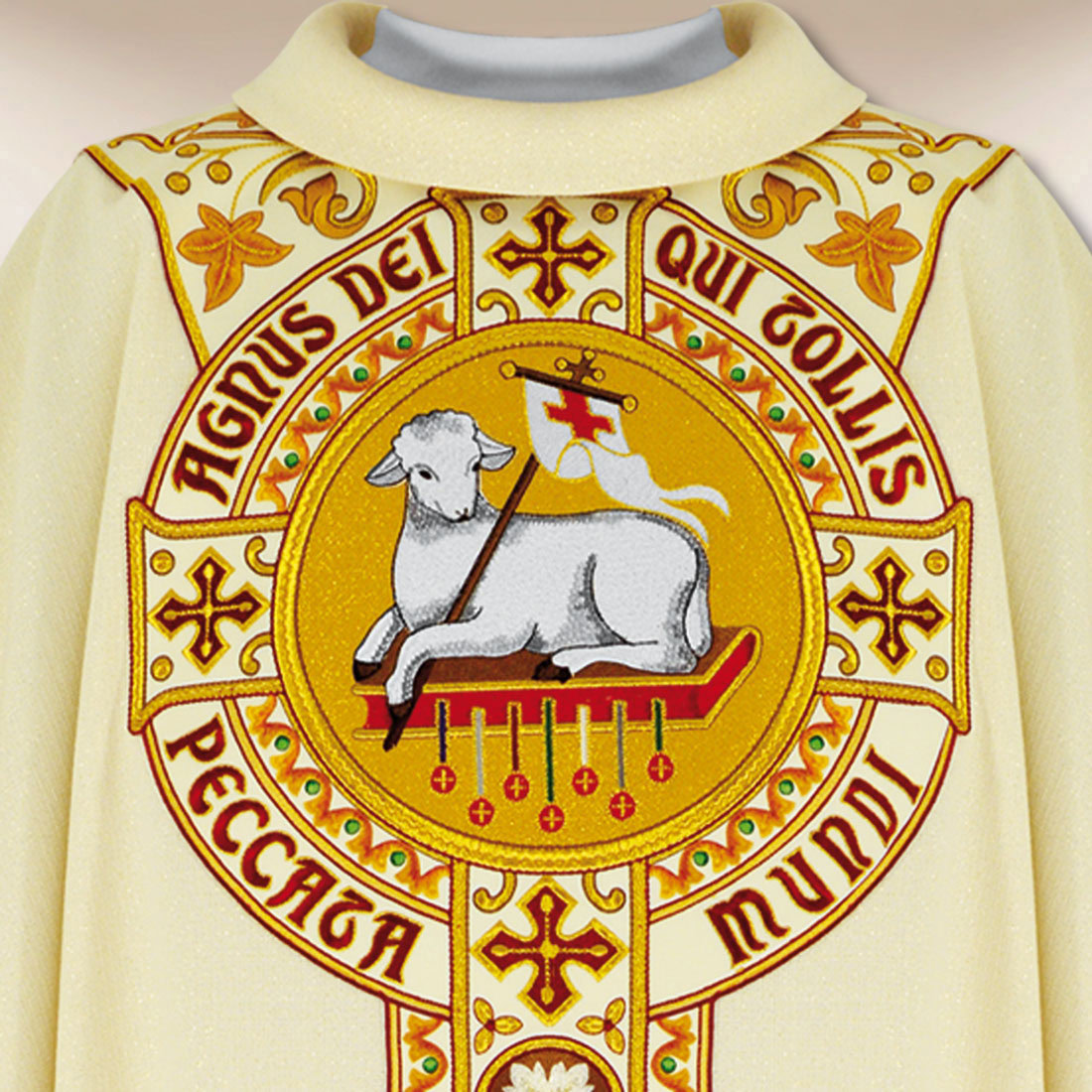 Embroidered Chasuble Lamb of God is an exceptional liturgical vestment, designed for solemn celebrations where the mystery of the Eucharist holds central significance. Embroidered Chasuble Lamb of God refers to the most important theme of decoration – the intricately embroidered Paschal Lamb, a symbol of Christ offering Himself for the salvation of the world.