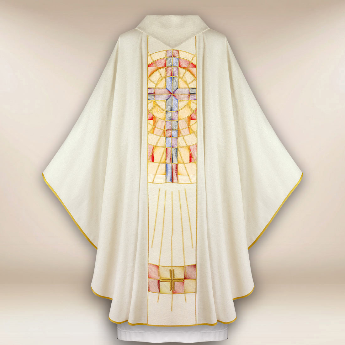 The ecru colour gives the vestment a calm, solemn and dignified character. For centuries, this colour has been associated with purity, brightness and the theological symbolism of light, which is why a chasuble in this style is perfect for sacramental celebrations, feasts with the Mother of God, the Easter season, as well as thanksgiving and jubilee Masses. Its elegance and subdued colours make it one of the most versatile models in liturgy.