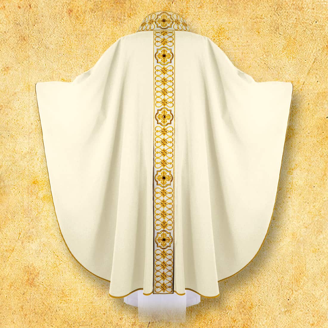 The embroidered “Renaissance” chasuble is an elegant liturgical vestment made of high-quality fabric, combining natural fibers with a rich, elegant pattern.gt;high-quality fabric, combining natural and synthetic fibers.