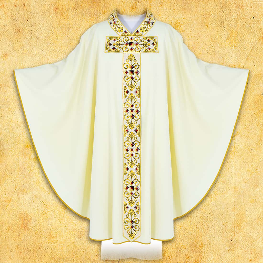 The embroidered “Te Deum” chasuble is an elegant liturgical vestment made of high-quality fabric, which is a blend of natural and synthetic fibers.