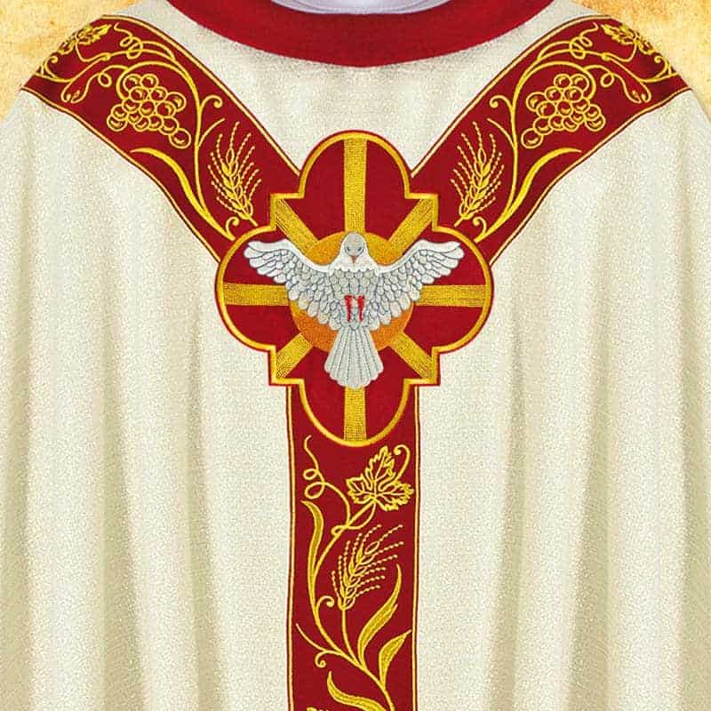 A ceremonial ecru liturgical chasuble with an embroidered Holy Spirit motif is a unique priestly vestment that combines the symbolism of faith, elegance, and comfort.