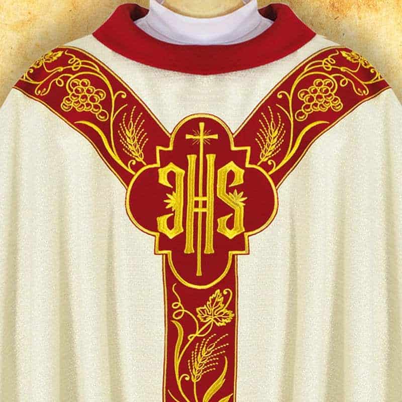 The ecru embroidered liturgical chasuble with the IHS symbol is an elegant priestly vestment that combines classic design with modern craftsmanship.