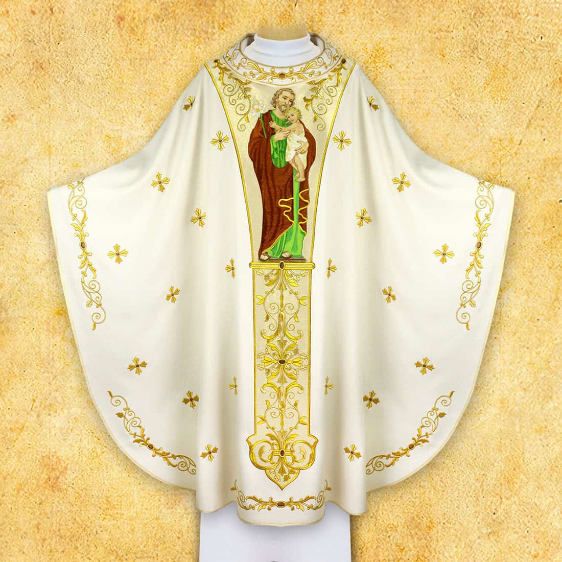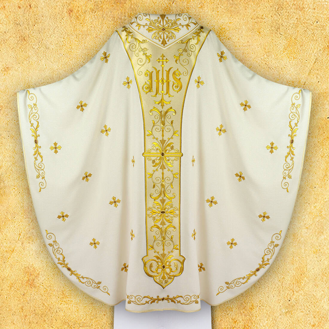 The chasuble is made of high-quality “Sacroline” fabric in ecru color, interwoven with gold thread. The belt is decorated with precise embroidery, whose gold accents perfectly match the fabric, emphasizing the solemn and sacred character of the vestment.The fabric is exceptionally soft to the touch, delicate, and drapes very well. The chasuble includes an inner stole. One size fits all. A chalice veil can be purchased separately.