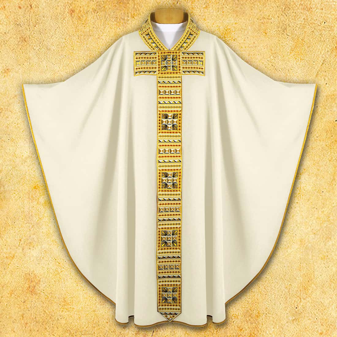Liturgical vestment in ecru is an elegant garment for priests, made of high-quality “Sacroline” fabric interwoven with subtle gold thread.The fabric is soft and delicate to the touch and drapes beautifully, ensuring comfort when worn.The fabric is made from a blend of natural fibers—viscose, linen, and silk—with a small amount of polyester added, combining breathability and lightness with durability and ease of care.The belt decorated with stones gives the vestment a solemn and unique character.The set includes a matching inner stole, making it a complete choice for Masses, parish celebrations, and liturgy on important church holidays.The universal size makes the chasuble suitable for every priest.