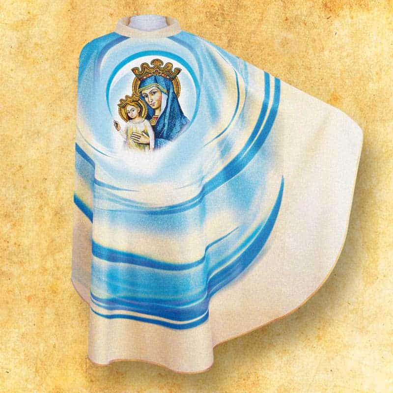 The image of the Virgin Mary was created using the photographic sublimation method, which guarantees the highest print quality, realistic colors, and durability for years to come.photographic sublimation, which guarantees the highest print quality, realistic colors, and durability for years to come.<br data-start="756" data-end="759" This technique ensures color depth and detailed reproduction, giving the chasuble an extremely dignified appearance. The chasuble includes a matching inner stole made of the same fabric. The chasuble is lined with white satin.gt;a matching inner stole made of the same fabric.