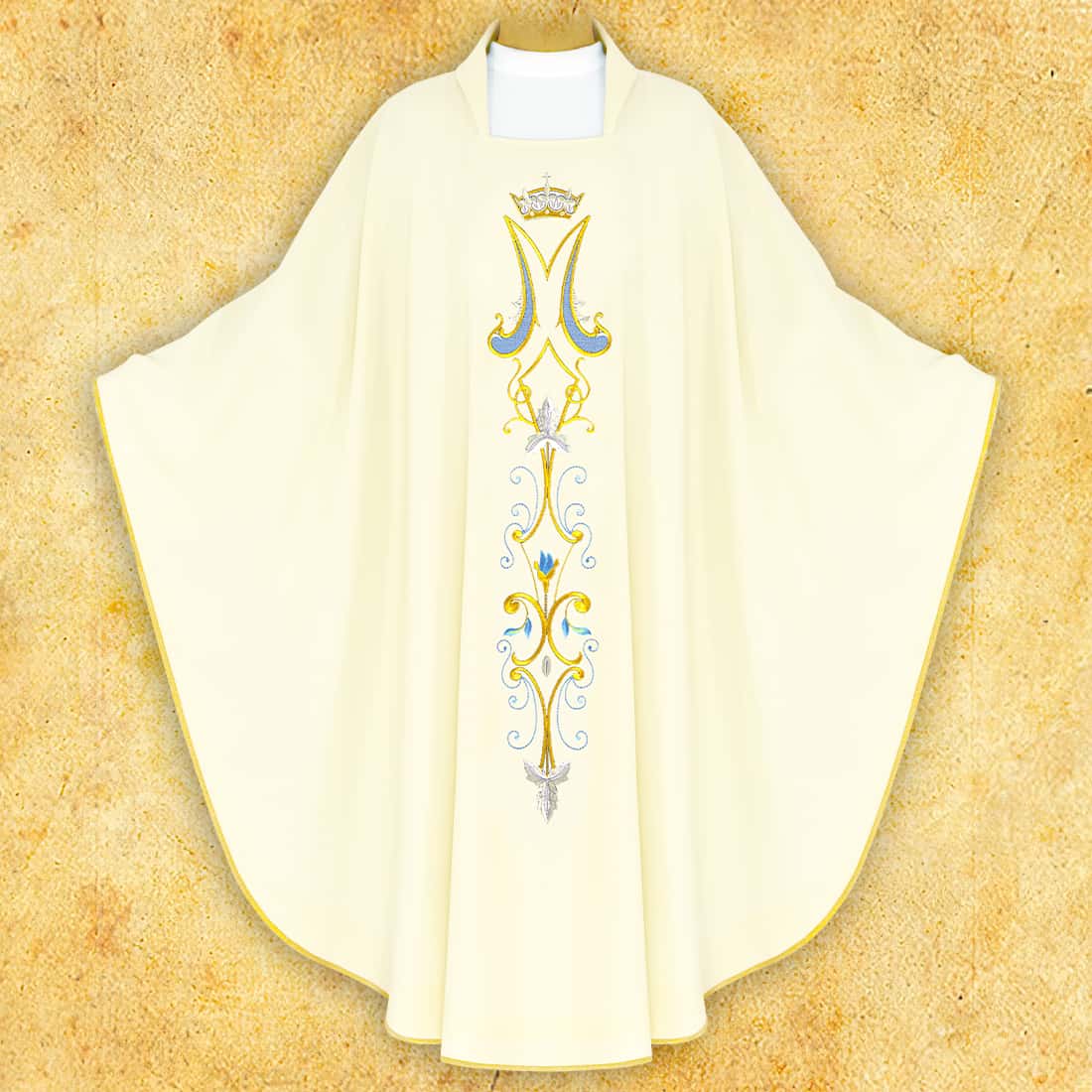 Elegant liturgical chasuble with Marian embroidery, made of high-quality fabric “Italian Tropic” in ecru color.