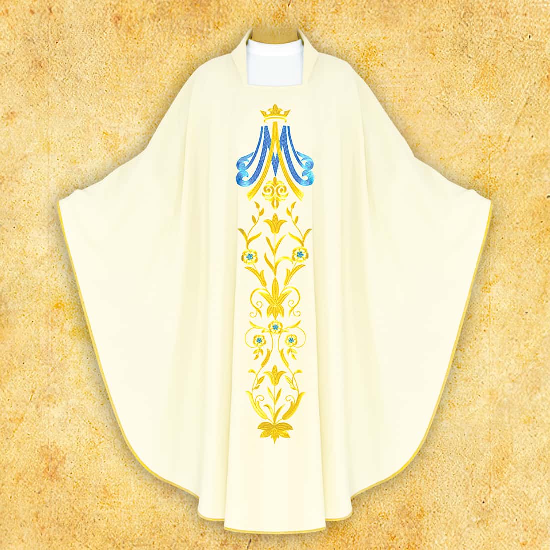 Elegant liturgical chasuble with Marian embroidery, made of high-quality fabric “Italian Tropic” in ecru color.