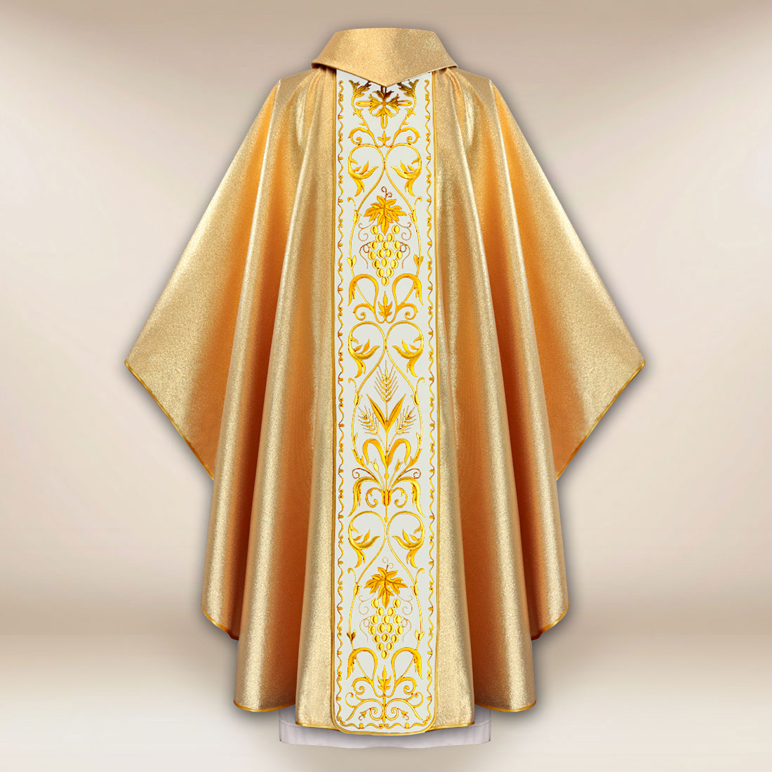 The chasuble with an embroidered plush band Chalice is a noble vestment intended for solemn celebrations, where classic Eucharistic symbolism is combined with high craftsmanship. The model is made from fabric with a subtle, sacred sheen, ensuring an elegant appearance and comfortable draping during the liturgy. The central band is crafted from soft cotton plush with a distinct texture, adding depth to the composition and distinguishing it from traditional galloons.