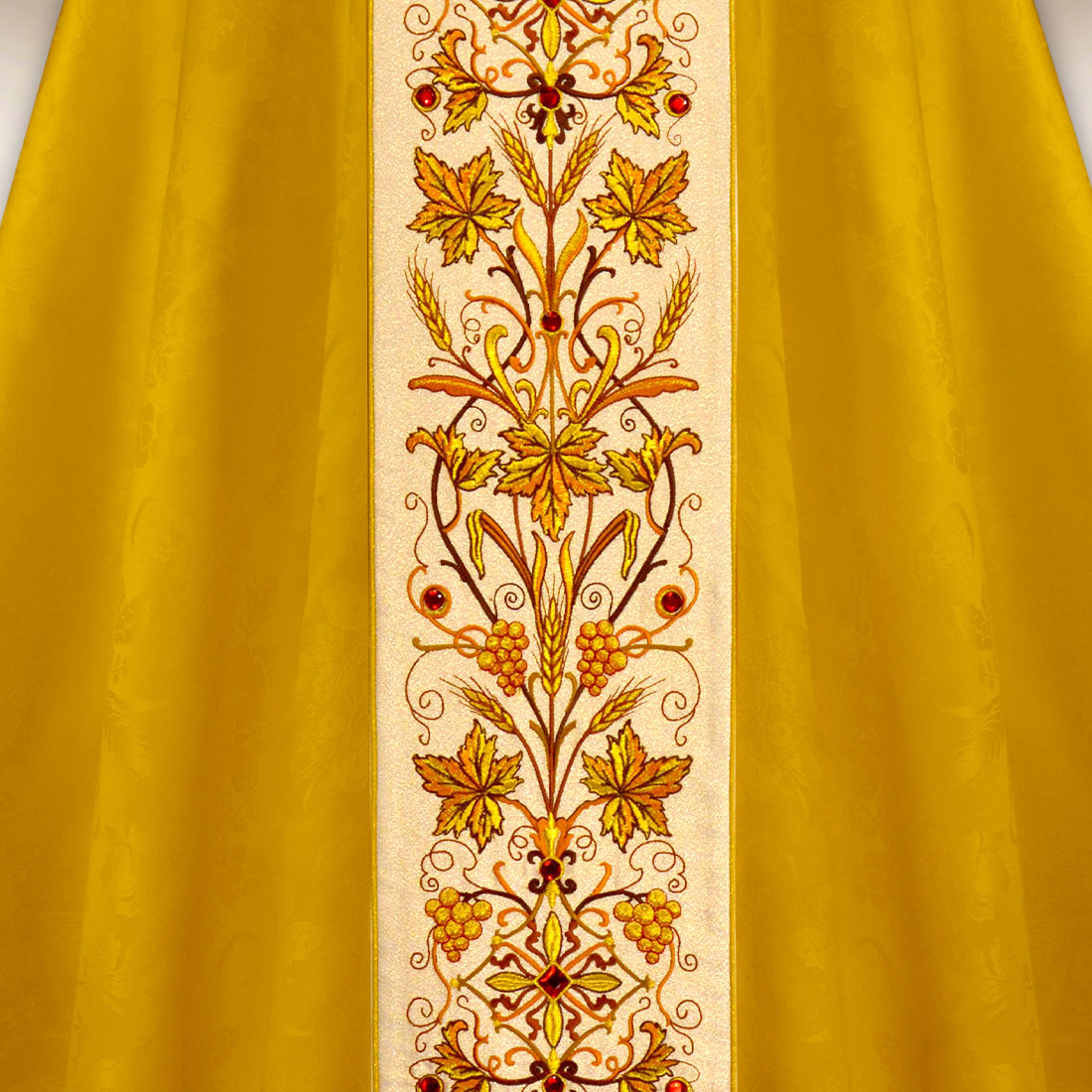Embroidered jacquard chasuble in gold, designed for solemn liturgical celebrations. The vestment is made from high-quality jacquard fabric with an elegant, subtle texture, distinguished by its lightness, softness, and beautiful draping during the Holy Mass. The decorative floral pattern – motifs of roses, wheat ears, grapes, and leaves – creates a harmonious composition that aligns with the liturgical aesthetic and sacred character of the garment.