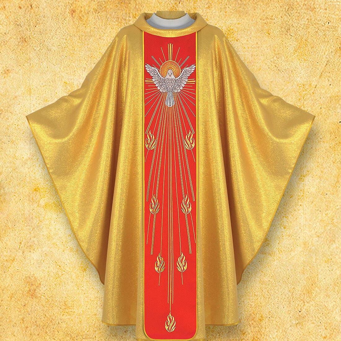 Liturgical vestment in gold, decorated with embroidered red braid with a Holy Spirit motif.The gold-colored collar emphasizes the solemn character of the vestment.The entire garment is made of high-quality fabric, which drapes elegantly and ensures comfort during celebrations.The set includes a matching inner stole.One size fits all priests.The chasuble is perfect for Pentecost and other liturgical celebrations.