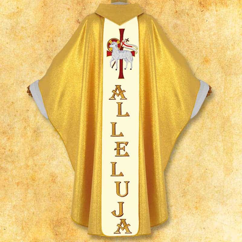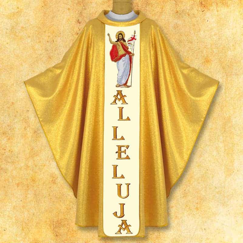 Embroidered liturgical chasuble made of high-quality gold brocade fabric.The fabric has a delicate sheen, is soft, pleasant to the touch, and drapes elegantly, ensuring comfort during celebrations.The central element of the decoration is an embroidered belt in ecru, depicting the figure of the Risen Jesus – a symbol of victory over death and Easter joy.The chasuble includes a matching inner stole, creating a complete and harmonious whole. The universal size makes the vestment suitable for any priest and perfect for Masses, processions, and solemn liturgical celebrations.