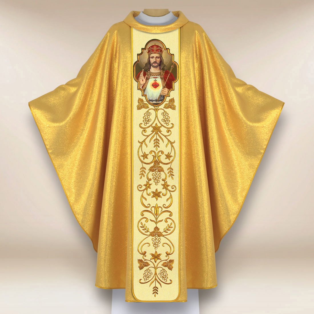 Chasuble with the Image of Christ the King is an exceptional liturgical vestment that emphasizes the royal dignity and reign of Jesus over all creation. The central image depicts Christ with the visible Sacred Heart – a symbol of love, mercy, and constant care for the Church. The image is surrounded by a decorative band embroidered with golden thread, creating a harmonious composition full of classical beauty and liturgical solemnity.