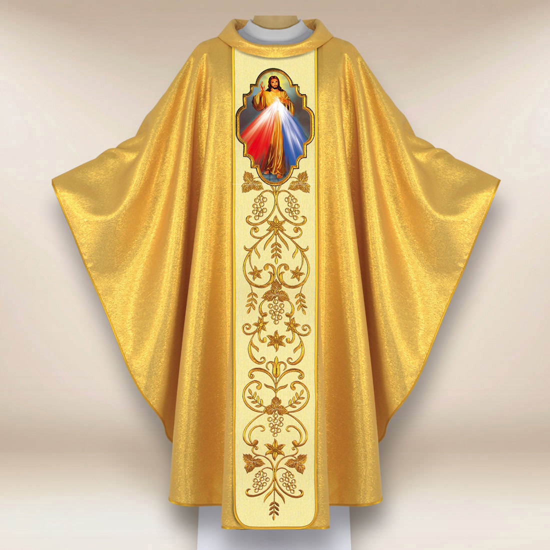 Golden chasuble with the image of Jesus Mercy and embroidered decorative band.