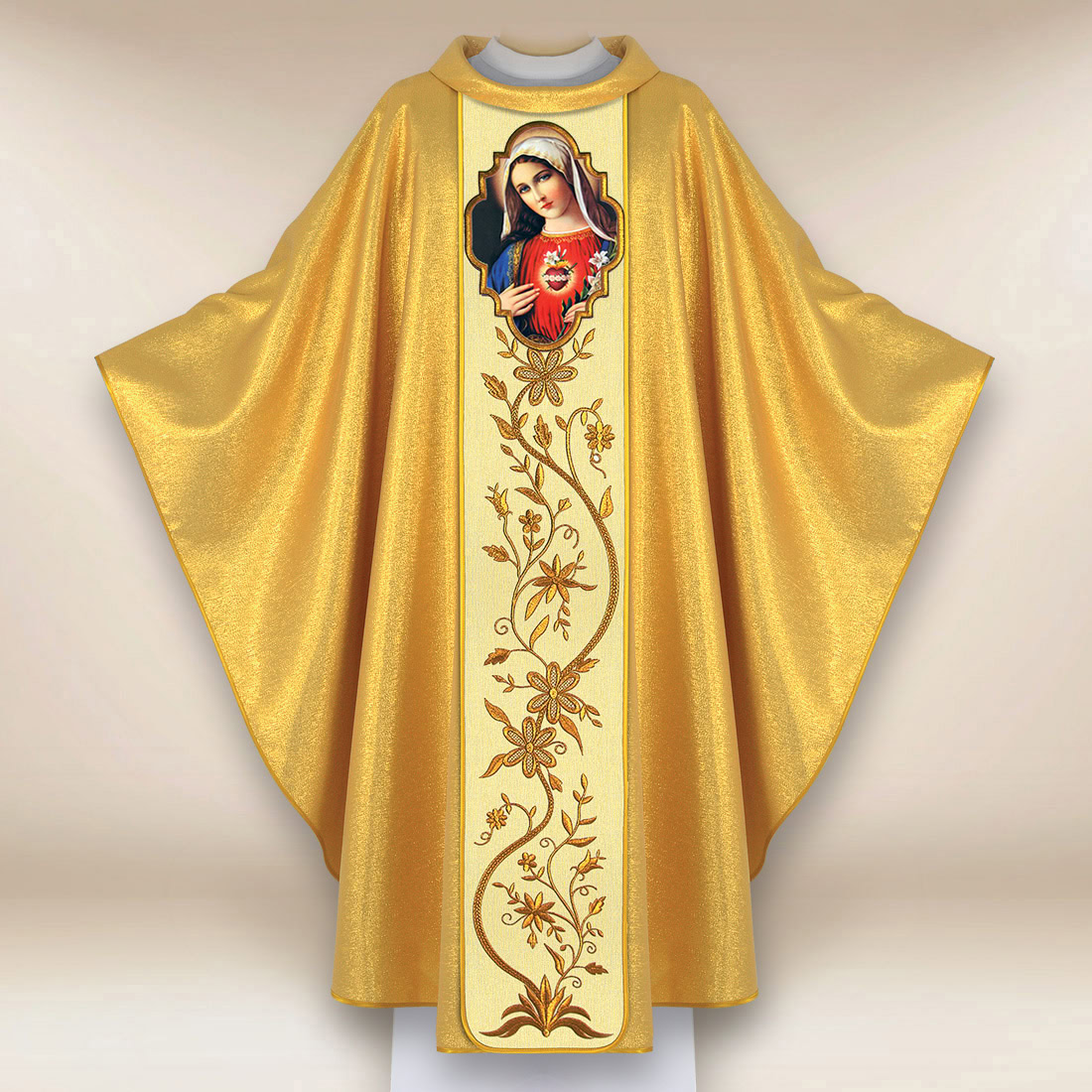 Chasuble with the Image of the Heart of Mary is a liturgical vestment of solemn and elevated character, made from elegant fabric with a subtle sheen that drapes beautifully during the celebration. The central focus is the image of Mary placed on a decorative panel, transferred onto the fabric using modern techniques that ensure exceptional durability and depth of color. The image is surrounded by a rich floral motif, intricately embroidered with golden thread, creating a harmonious and serene composition reminiscent of the classic style of liturgical vestments. The fabric is lightweight, soft, and drapes elegantly in motion, providing comfort for both daily celebrations and larger ceremonies. Thanks to the combination of embroidery and precise printing, the chasuble stands out for its durability, color depth, and aesthetic finish. The golden hue adds brilliance to the overall design while remaining harmonious and balanced.