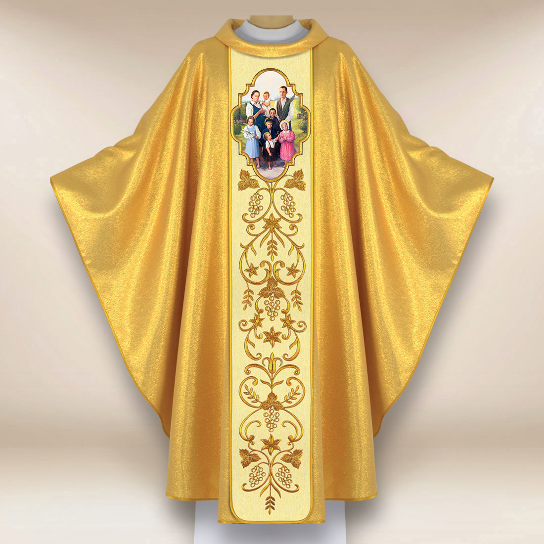 Chasuble with the Image of the Ulma Family is an excellent choice for days dedicated to family, beatifications, catechesis on the sanctity of life, as well as a liturgical vestment for celebrations in parishes that wish to emphasize the value of the Christian family vocation. The set includes an internal stole. Universal size.