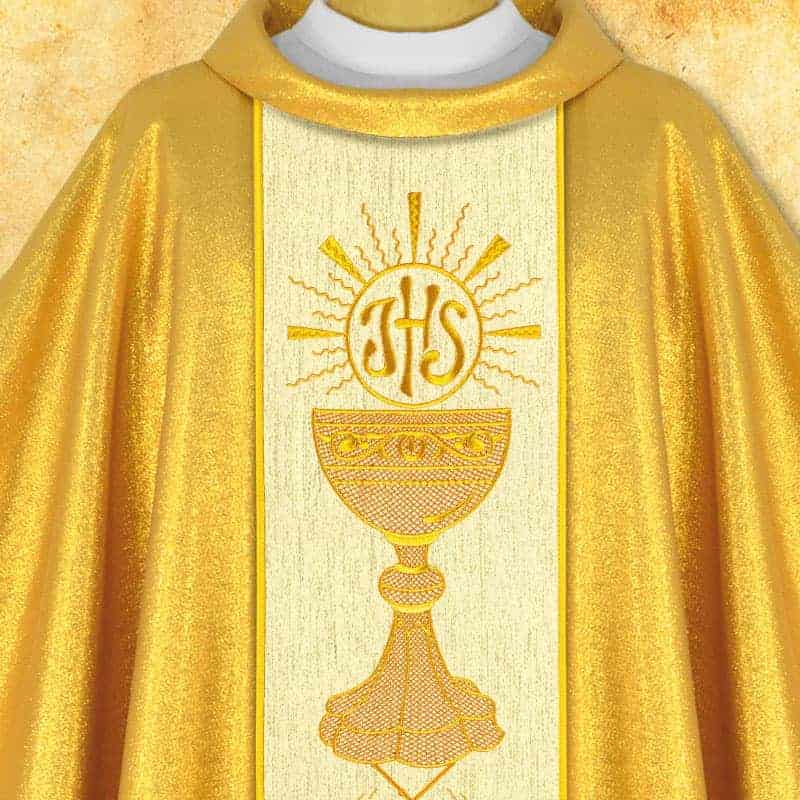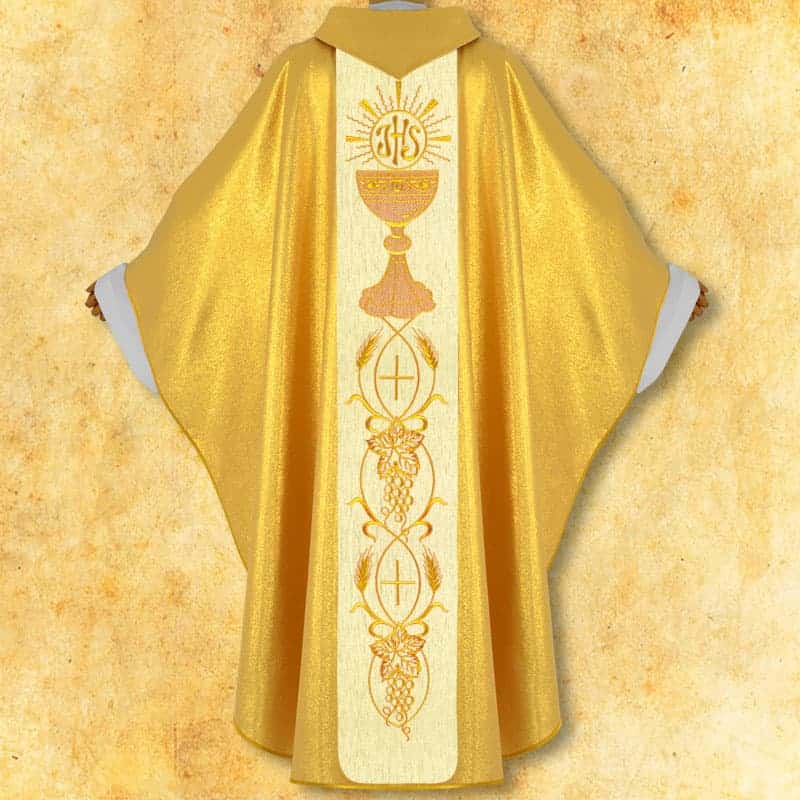 Sewn braid made of high-quality fabric in the color ecru, delicately interwoven with gold thread, decorated with embroidered motif of a Eucharistic chalice – a symbol of Sacrifice and the Eucharist. />The back of the chasuble features the same embroidery as the front, giving the whole a harmonious and symmetrical appearance.