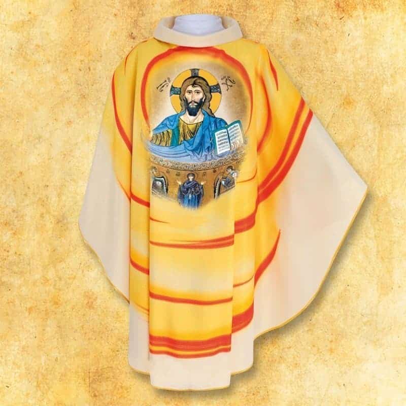 The image of Jesus of Cefalu was created using the photographic sublimation, which guarantees the highest print quality, realistic colors, and durability for years.<br data-start="756" data-end="759" This technique ensures color depth and detailed reproduction, giving the chasuble an extremely dignified appearance. The chasuble includes a matching inner stole made of the same fabric. The chasuble is finished with a gold-colored trim.gt;a matching inner stole made of the same fabric.