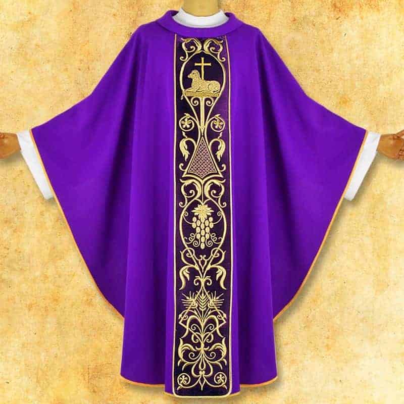 The embroidered “Lamb” liturgical vestment is a unique garment designed for solemn celebrations.nMade of luxurious purple fabric, which is light, soft, and gives the whole garment an elegant, sacred character.