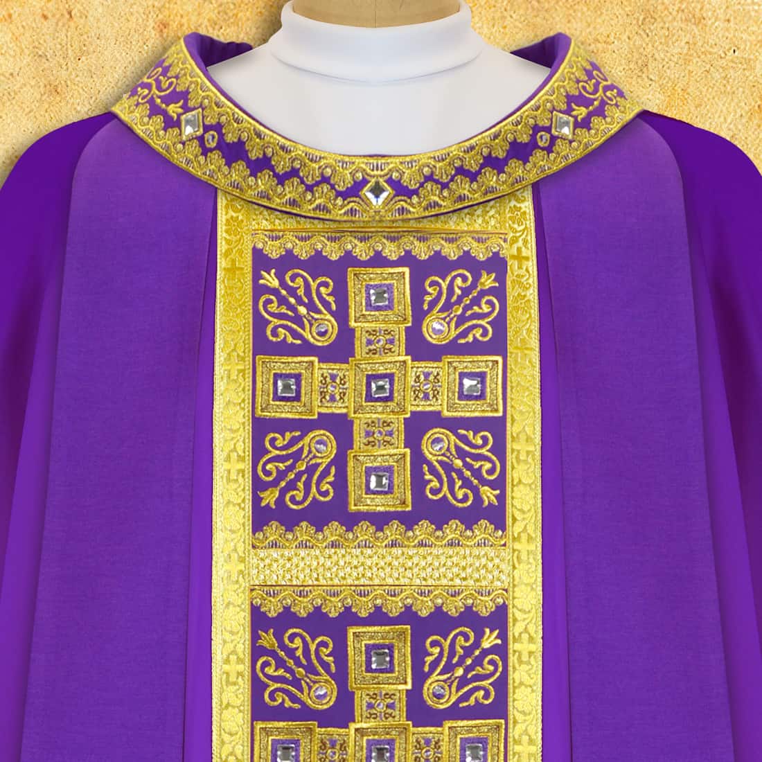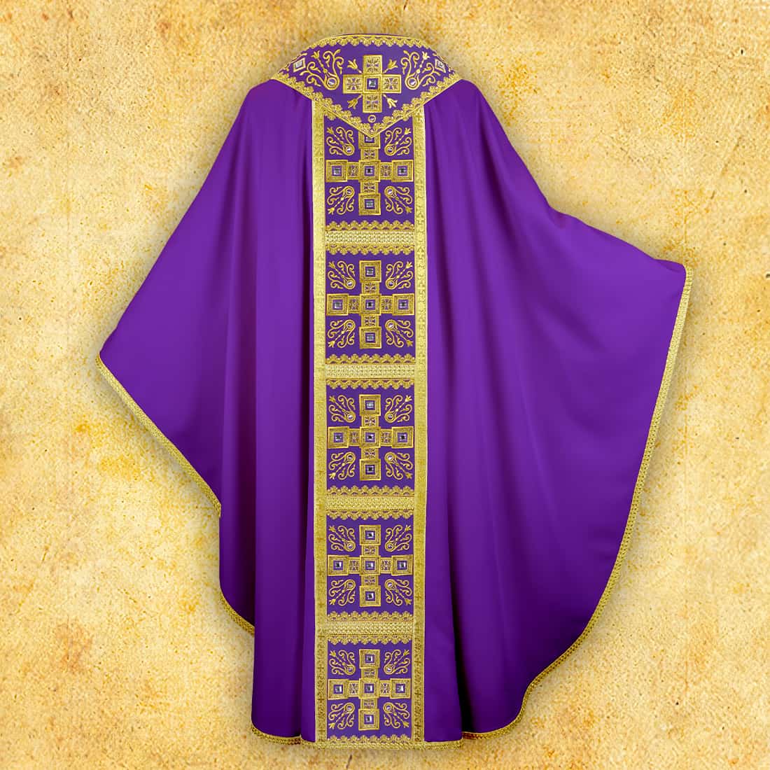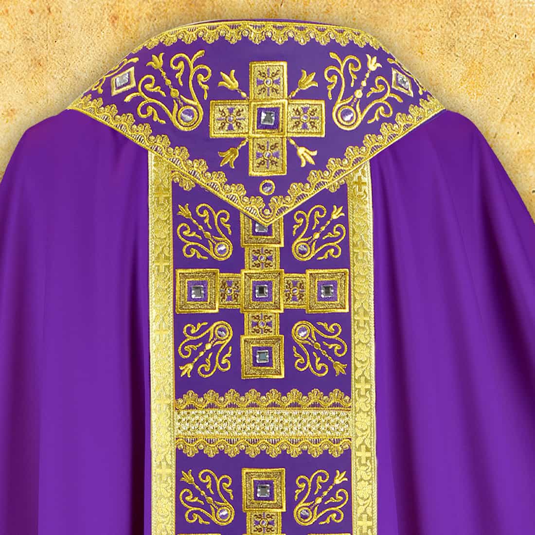 Embroidered liturgical vestment made of high-quality “Satinowool” fabric.nThe fabric is soft, delicate, and elegantly draping, combining natural and synthetic fibers, thanks to which the chasuble drapes perfectly and ensures comfort during use.The chasuble is decorated with rich gold thread embroidery on the collar, braid, and stule, and the whole is additionally hand-decorated with stones.Its unique character is emphasized by Italian braided trimmings in the color of old gold.The set includes an inner stole, perfectly matched to the whole.The chasuble is available in a one size fits all, suitable for every priest.