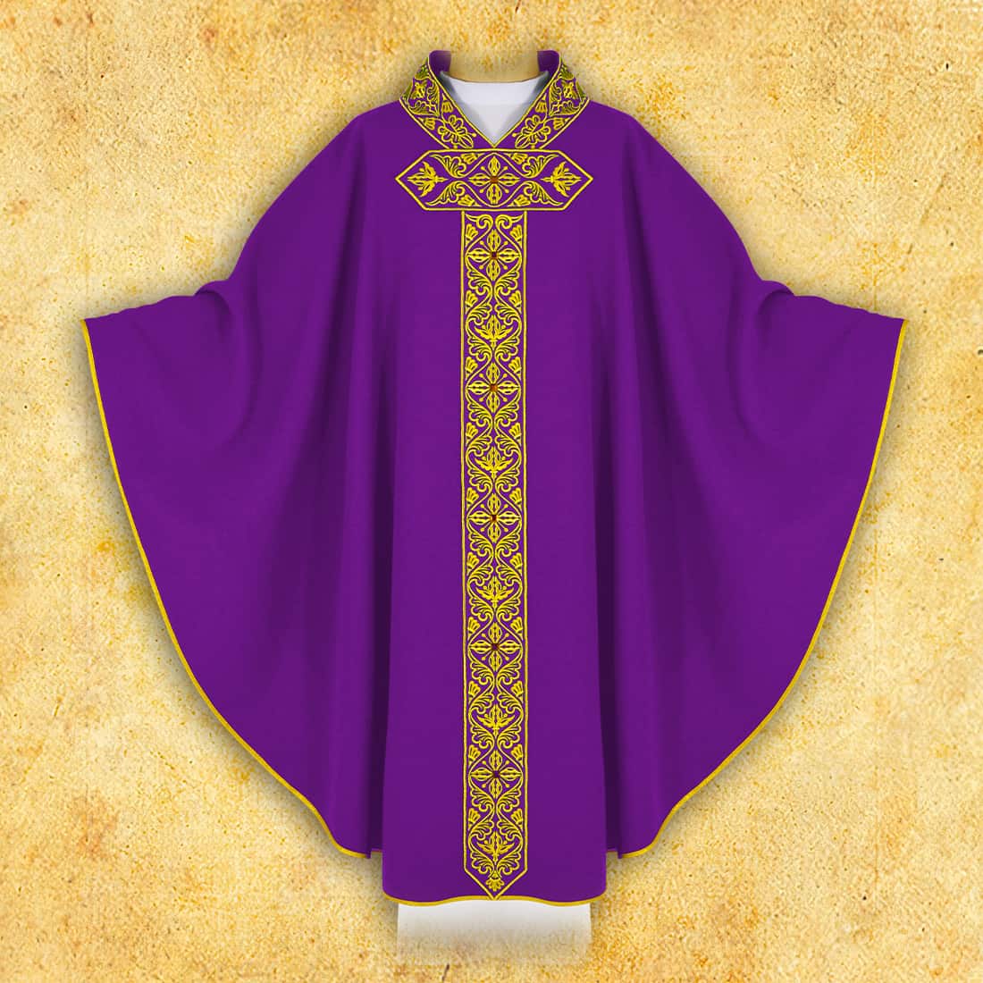 The fabric is soft, light, and exceptionally pleasant to the touch, thanks to which the chasuble drapes perfectly and ensures comfort during celebrations. The decorative stripes have been embroidered and hand-decorated with stones, which emphasizes the solemn character of the garment.gt;embroidered and hand-decorated with stones, which emphasizes the solemn character of the garment.