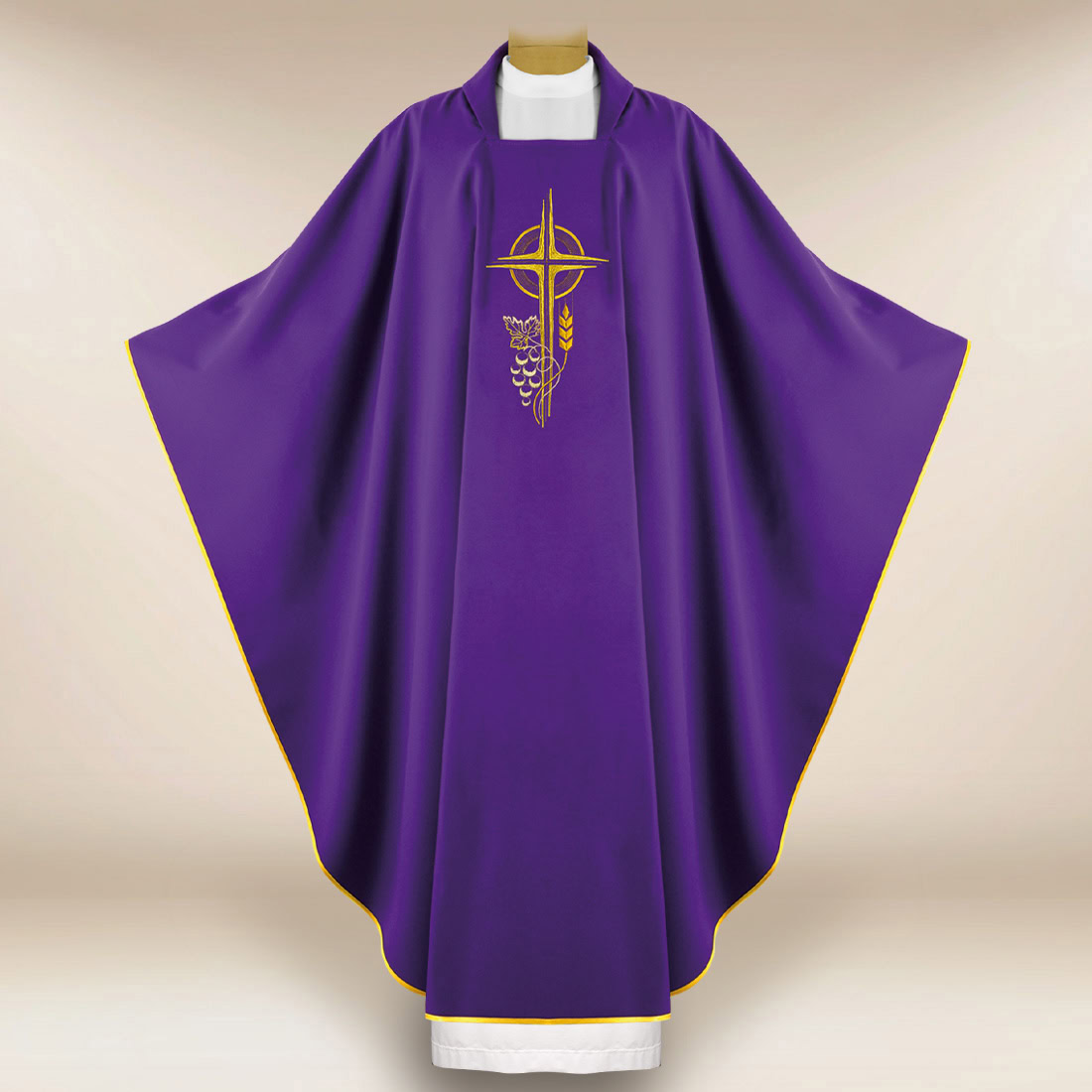 The central element of the chasuble is an embroidered cross combined with grapes and wheat ears, symbolizing the fruits of the earth and the work of human hands, while also serving as a clear reference to the Eucharist. The embroidery is executed with great attention to detail, making the motif elegant and distinct against the purple fabric.