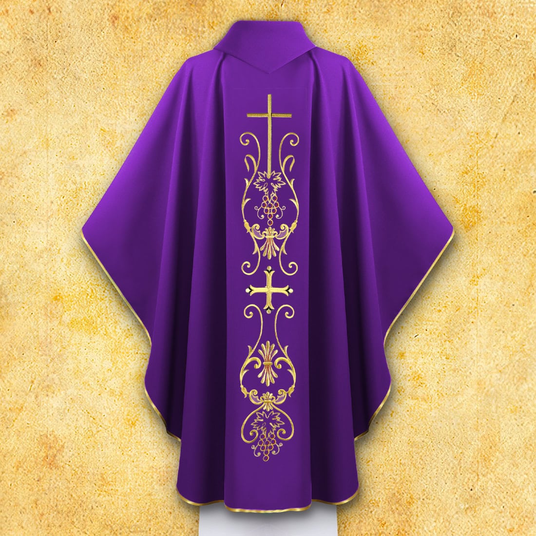 Liturgical chasuble made of high-quality “Tropic Italian” fabric.nThe fabric is soft, light, and pleasant to the touch, thanks to which the chasuble fits perfectly and ensures comfort during use.The durable fiber blend guarantees resistance to creasing and easy care.The set includes an inner stole, perfectly matched to the whole.The chasuble is available in a one size fits all, suitable for every priest.