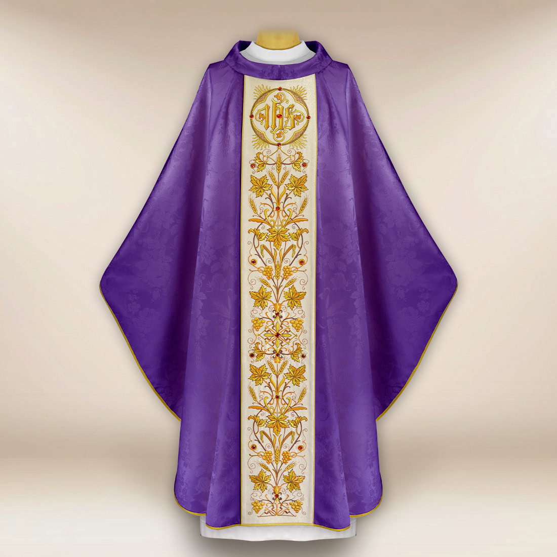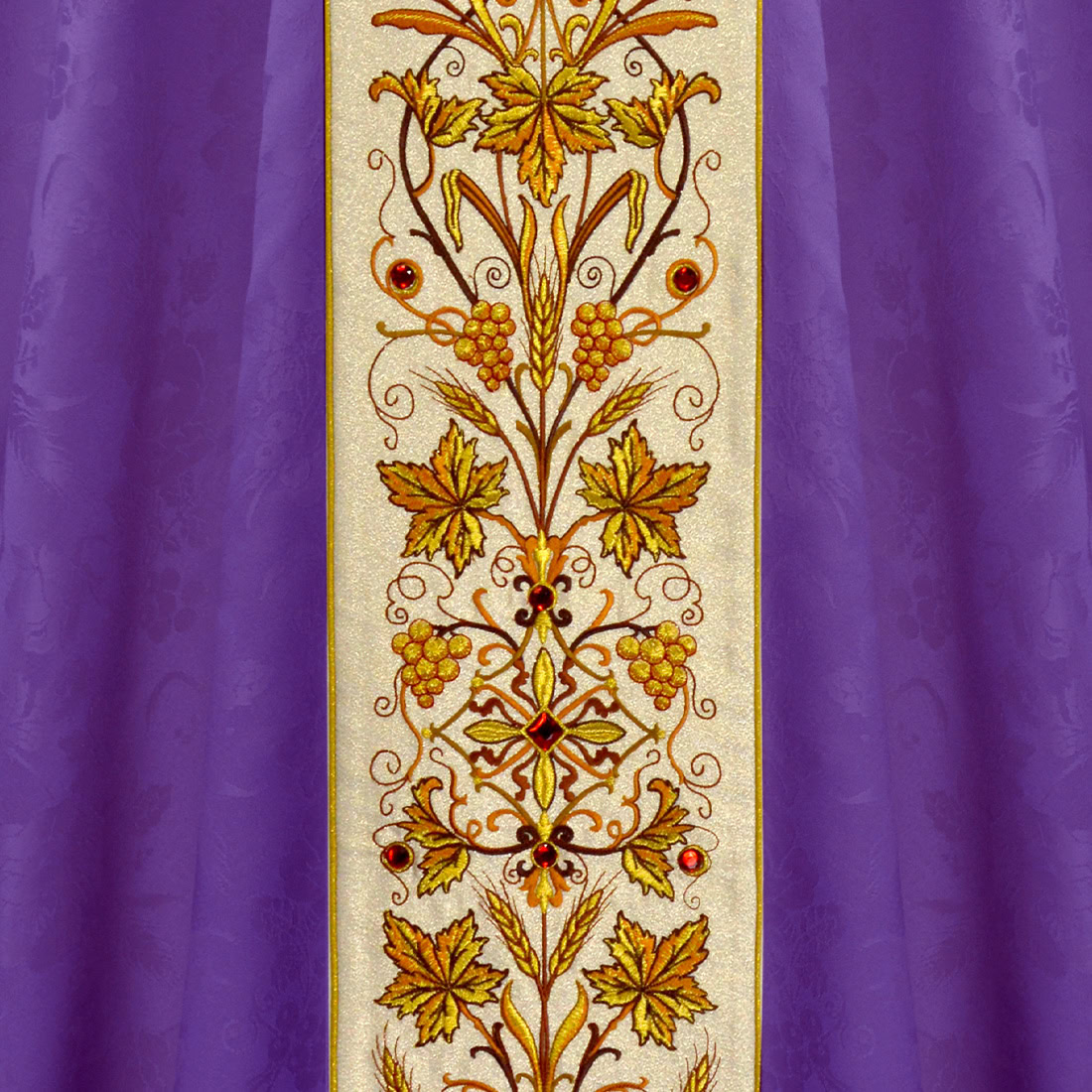 Urbanowicz Haft Polska presents a purple jacquard embroidered chasuble, designed specifically for the celebrations of penitential and reflective periods. This elegant liturgical vestment is made from high-quality jacquard fabric, featuring a decorative floral pattern – subtle motifs of roses, wheat ears, grapes, and leaves – creating a harmonious composition with a deep, spiritual expression. The fabric is soft to the touch, delicate, and slightly flowing, which gives the entire vestment a natural fluidity and exceptional elegance during the liturgy.