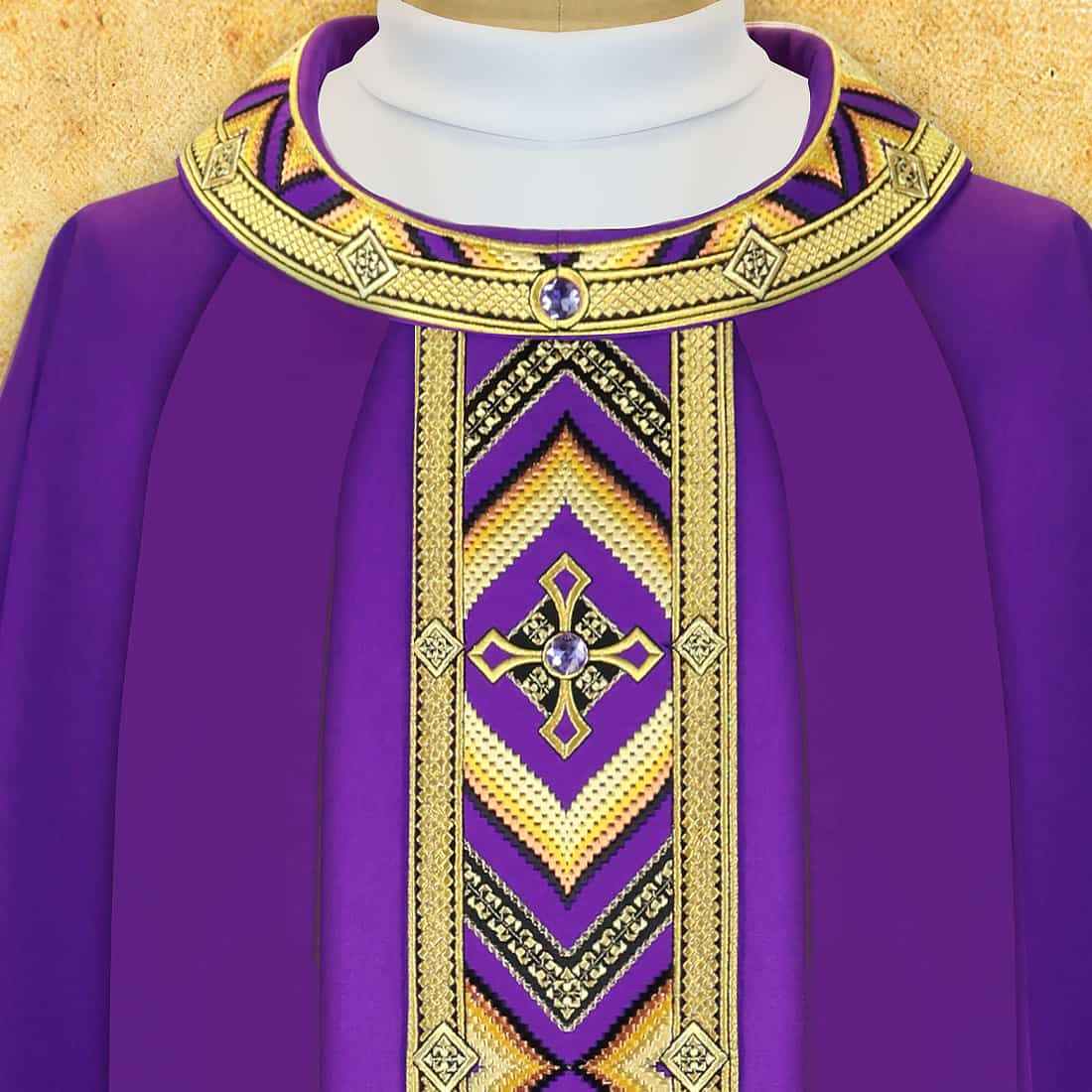 Exclusive liturgical chasuble with richly embroidered belt and collar in the color of the chasuble, made of high-quality “Satinowool” fabric.
