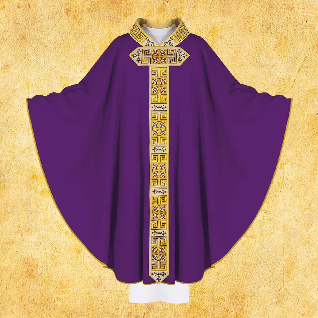 The fabric is soft, light, and exceptionally pleasant to the touch, thanks to which the chasuble drapes perfectly and ensures comfort during celebrations. The decorative stripes have been embroidered and hand-decorated with stones, which emphasizes the solemn character of the garment.gt;embroidered and hand-decorated with stones, which emphasizes the solemn character of the garment.