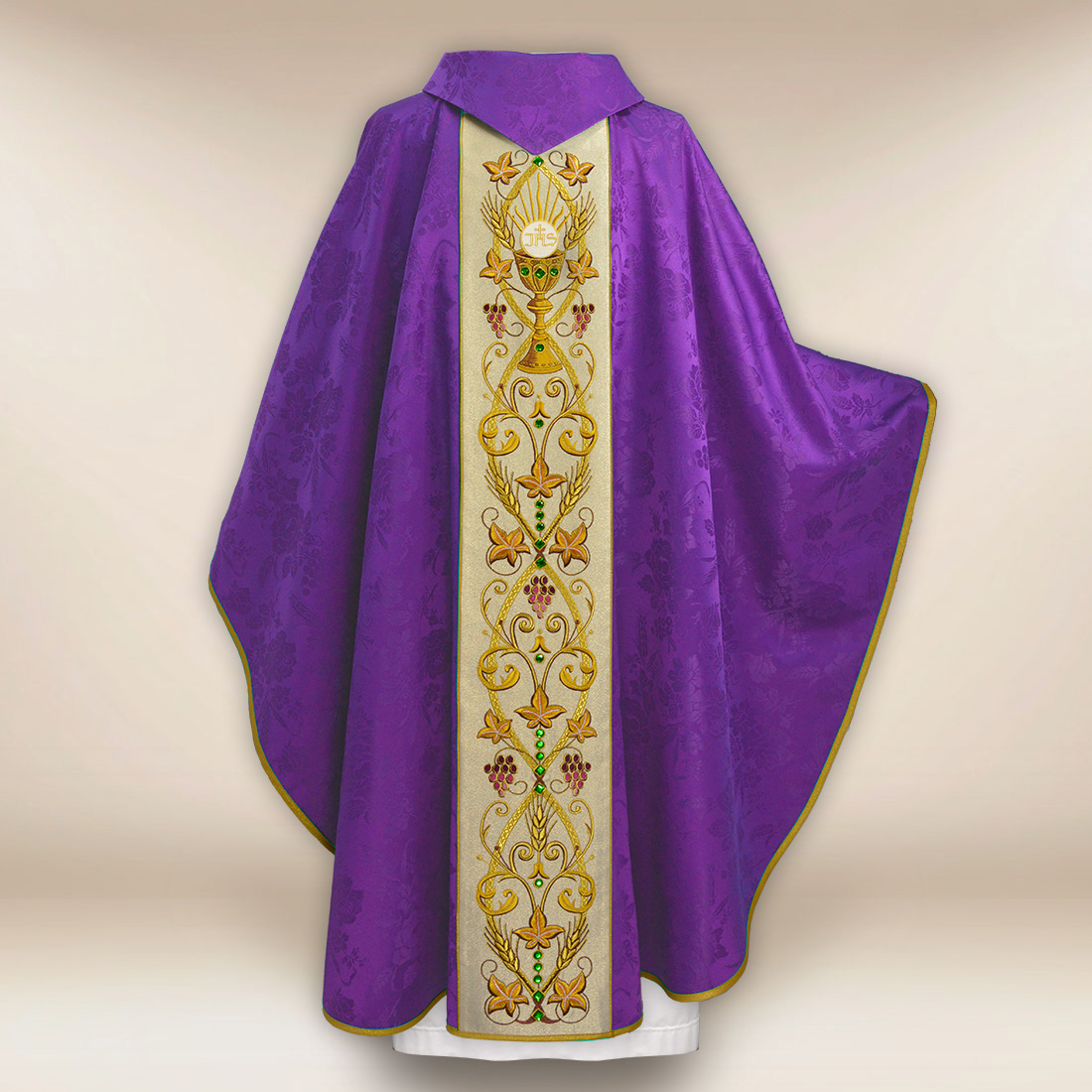 Embroidered chasuble with the chalice motif Prelato in purple is a liturgical vestment designed for periods of deep reflection, prayer, and inner focus. The color purple has accompanied Advent and Lent for centuries, leading us into a space of spiritual preparation. The vestment is made from elegant jacquard fabric, adorned with a subtle floral pattern, whose soft texture and natural drape emphasize the dignified character of the celebration.