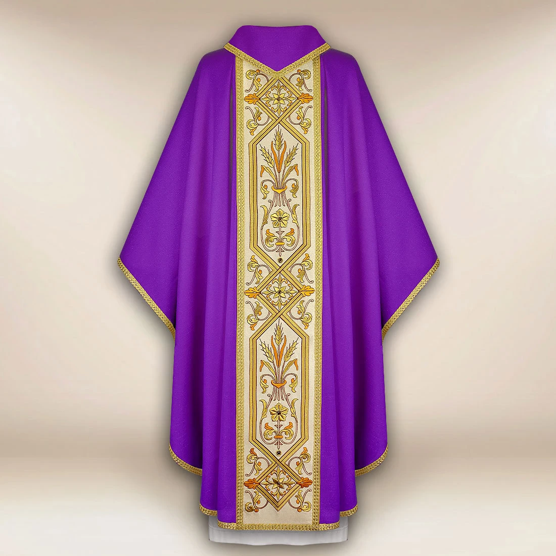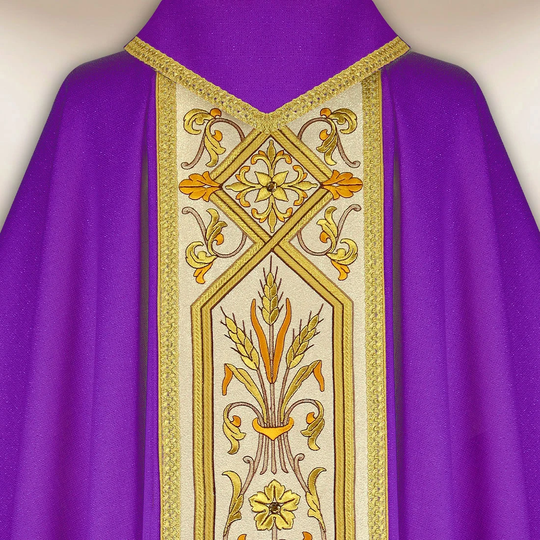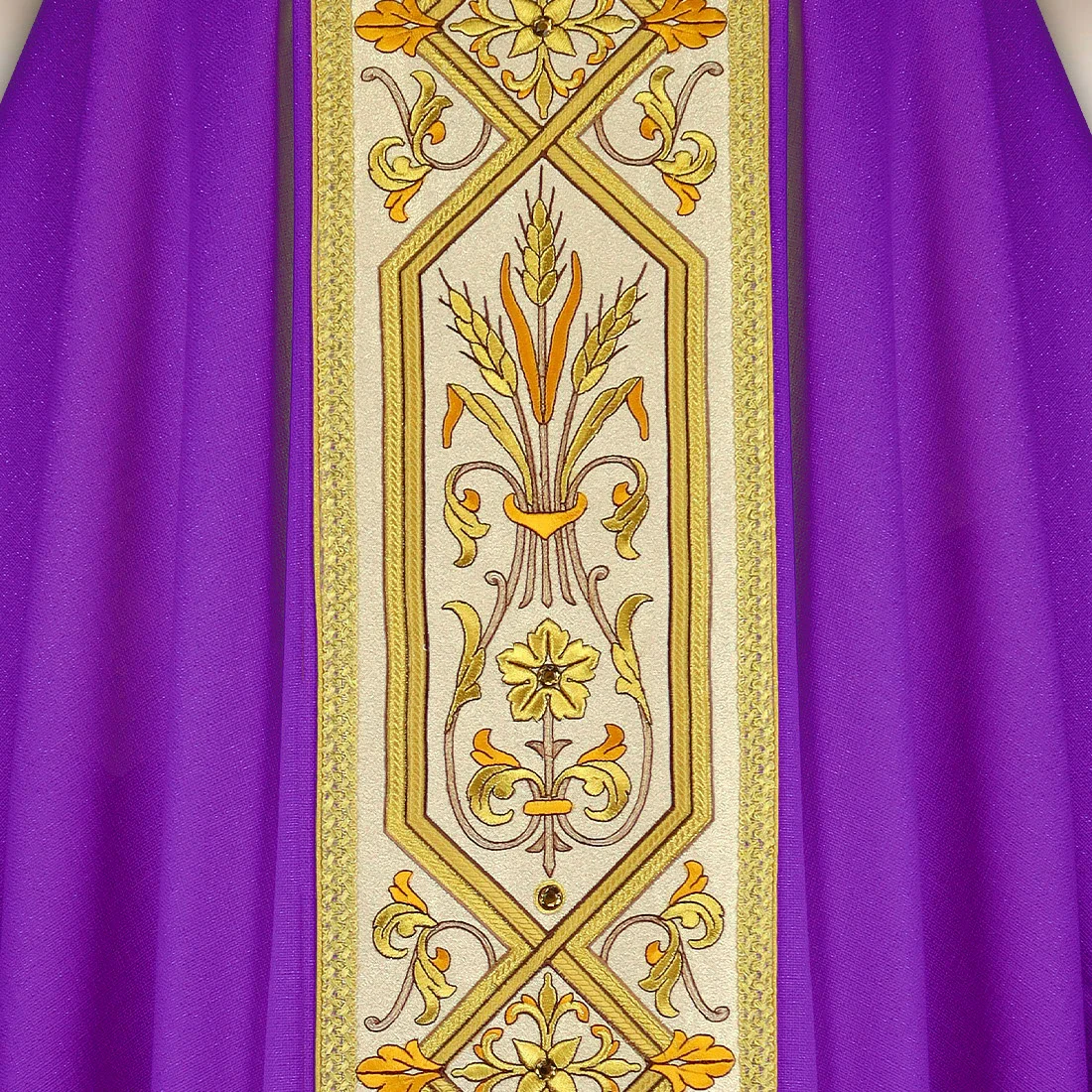 Purple embroidered chasuble with a band is an exclusive liturgical garment designed for solemn celebrations requiring exceptional decor and deep symbolism. The fabric is a blend of natural fibers (85% – viscose, linen, silk) and synthetic fibers (15% – polyester), ensuring durability and an elegant appearance. The material is soft, lightweight, and pleasant to the touch, allowing the chasuble to drape naturally and present itself with great dignity during the liturgy.