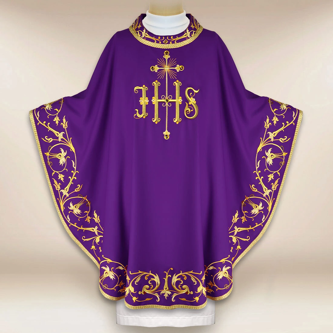 Embroidered IHS Chasuble Purple is a liturgical garment with deep symbolic significance, intended for the celebration of penitential periods, anticipation, and reflection. The centrally placed IHS symbol – the monogram of the Name of Jesus – serves as the spiritual center of the composition, emphasizing the Christological character of the liturgy and its sacred gravity.