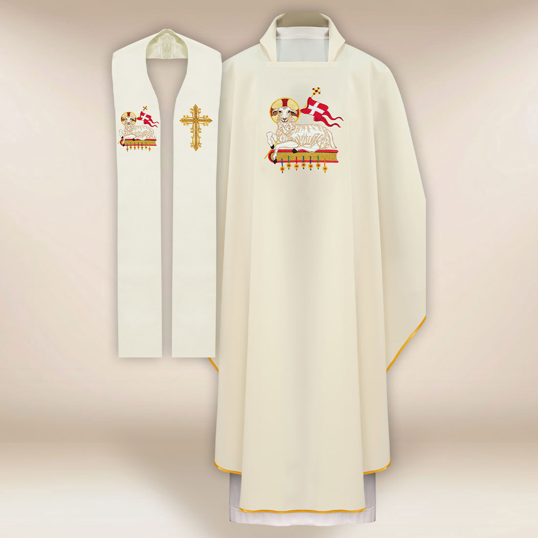 By combining eucharistic symbolism, careful craftsmanship, and functional design, the chasuble and stole set with the symbol of the Lamb is a proposal that highlights the beauty of the liturgy and enriches every celebration in the sacred space.