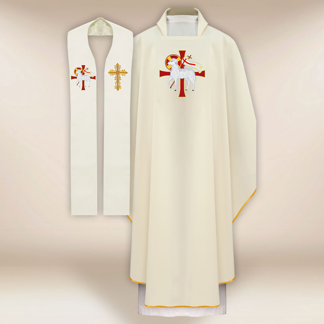 By combining eucharistic symbolism, careful craftsmanship, and functional design, the chasuble and stole set with the symbol of the Lamb is a proposal that highlights the beauty of the liturgy and enriches every celebration in the sacred space.