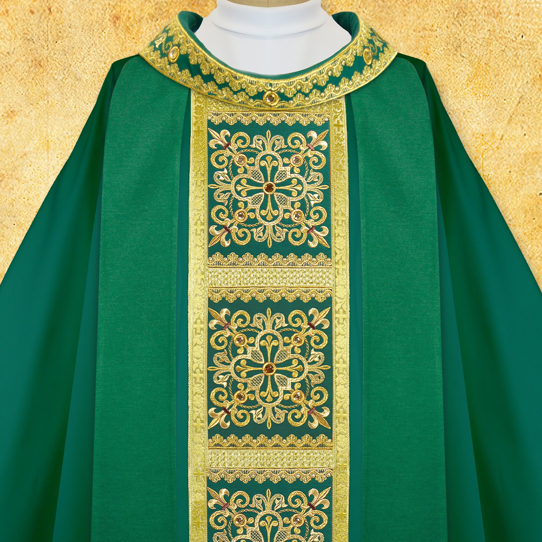 Green embroidered chasuble made of Satinowool fabric, decorated with gold embroidery and hand-applied stones.Finished with Italian trimmings in antique gold. Matching stole included. Product Urbanowicz Haft Polska – elegance, tradition, and spiritual beauty of liturgy.