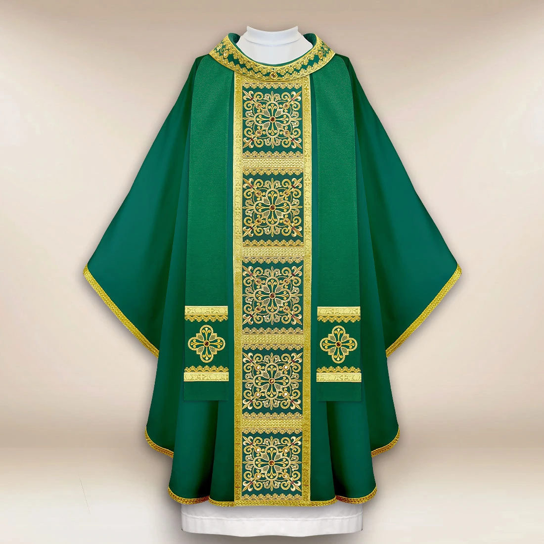 Embroidered liturgical chasuble in green is adorned with rich gold thread embroidery placed on the collar, galloon, and stole, giving it a unique, ceremonial character. An additional decorative element is hand-applied stones that subtly shimmer in the light, highlighting the sacred and representative nature of the garment. The edges are finished with Italian braided trim in old gold, adding a refined style and class to the chasuble.