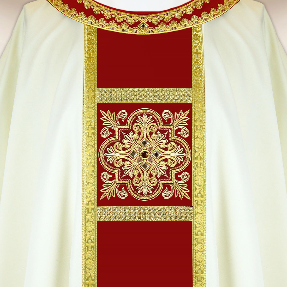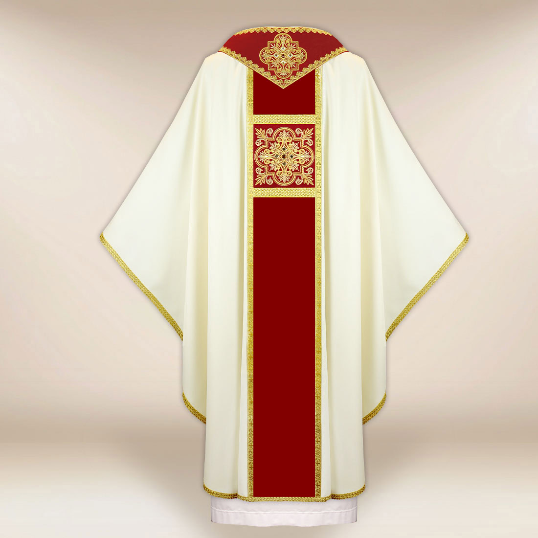 Embroidered ecru chasuble with a burgundy band is perfect for solemn Masses, church feasts, anniversaries, and celebrations requiring an elevated liturgical setting. The light background, gold embroidery, and burgundy accents create a garment that unites tradition, aesthetics, and spiritual dimension into one cohesive whole.