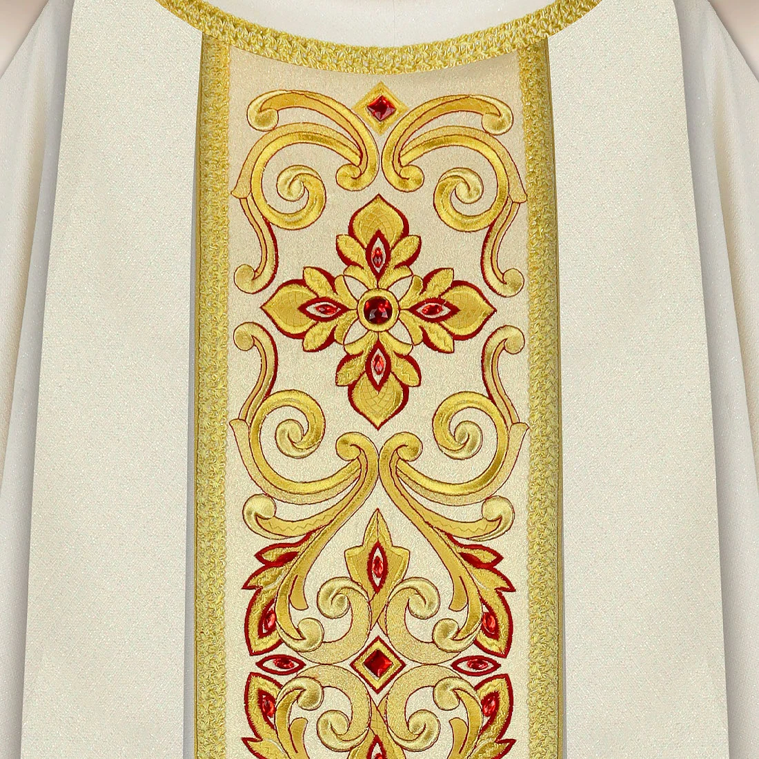 Each element has been carefully finished with decorative trimmings that emphasize the liturgical line of the garment. Precisely crafted details ensure that the chasuble presents itself majestically from any perspective – in procession, at the altar, or during solemn celebrations. The set includes a matching inner stole, maintained in the same style, creating a cohesive and elegant liturgical ensemble.