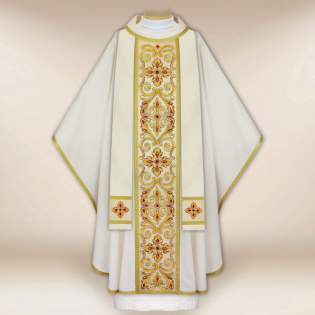 The universal cut allows the garment to drape naturally on any priest’s silhouette, providing freedom of movement and high comfort of use. It is an ideal choice for communities and celebrants seeking a garment that combines liturgical tradition, distinctive aesthetics, and high-quality craftsmanship. Such a refined embroidered liturgical chasuble becomes a worthy adornment for the most important celebrations of the church year.