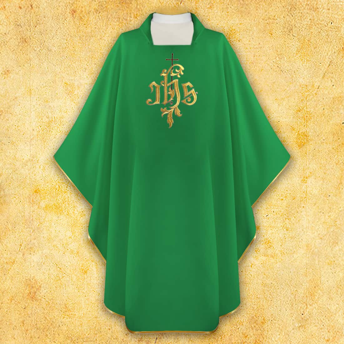 Embroidered Chasuble IHS is a classic green liturgical garment, where simplicity of form combines with vivid symbolism. The central embroidery depicting the Name of Jesus — IHS — is executed in an elegant, ornamental style, giving the chasuble a solemn and timeless character. The IHS symbol, present in the Church’s tradition for centuries, emphasizes the spiritual dimension of the celebration and focuses attention on the Mystery of the Eucharist. The embroidered “IHS” chasuble is perfect for Holy Mass during Ordinary Time and in situations requiring a classic, subdued aesthetic.