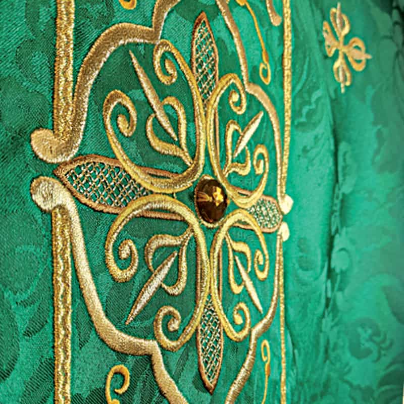 The robe is made of <strong data-start="1014" data-end="1084"&high-quality jacquard fabric with a subtle floral pattern, which symbolizes life, faith, and spiritual rebirth.The green fabric is soft, light, and delicate, and thanks to its natural weave, it drapes beautifully, providing the priest with comfort and elegance during liturgical celebrations.comfort and elegance during liturgical celebrations.