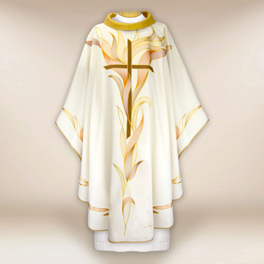 This liturgical chasuble embroidered ecru cross is perfect for celebrations of martyrs, apostolic feasts, retreats, and liturgies requiring an emphasis on spiritual dynamism and the action of the Holy Spirit.