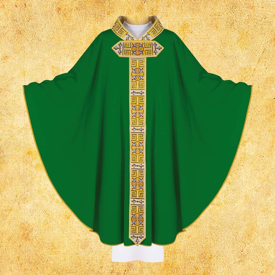 The embroidered “Paradiso” chasuble is an elegant liturgical vestment made of high-quality fabric, combining natural fibers with synthetic fibers.gt;high-quality fabric, combining natural and synthetic fibers.