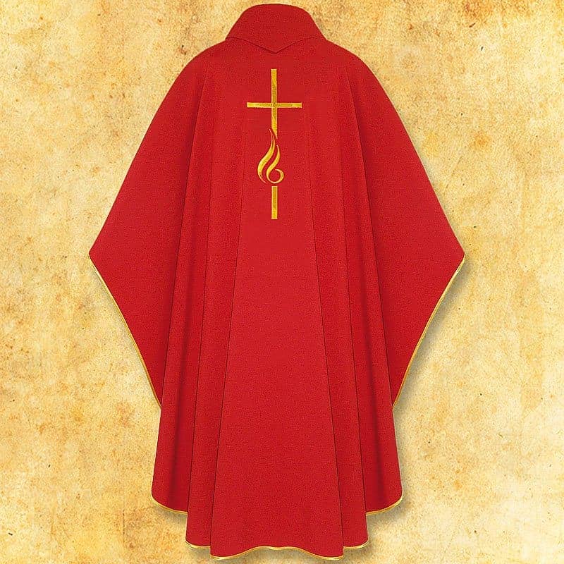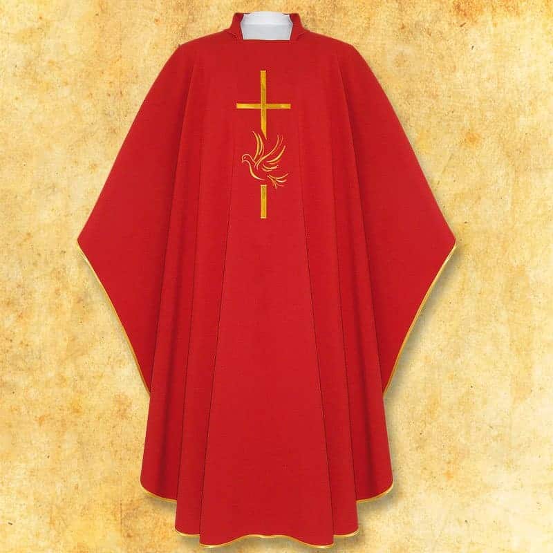 Liturgical vestment with a Holy Spirit motif, made of high-quality Italian Tropic fabric.nThe soft, light, and pleasant-to-the-touch fabric makes the vestment drape beautifully and ensures comfort during the celebration.The durable fiber blend guarantees crease resistance and ease of care.The set includes a matching inner stole, creating a cohesive whole.One size fits all priests.The perfect choice for Pentecost and other liturgical celebrations.
