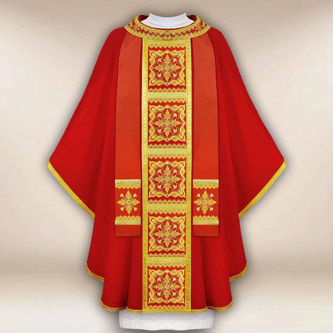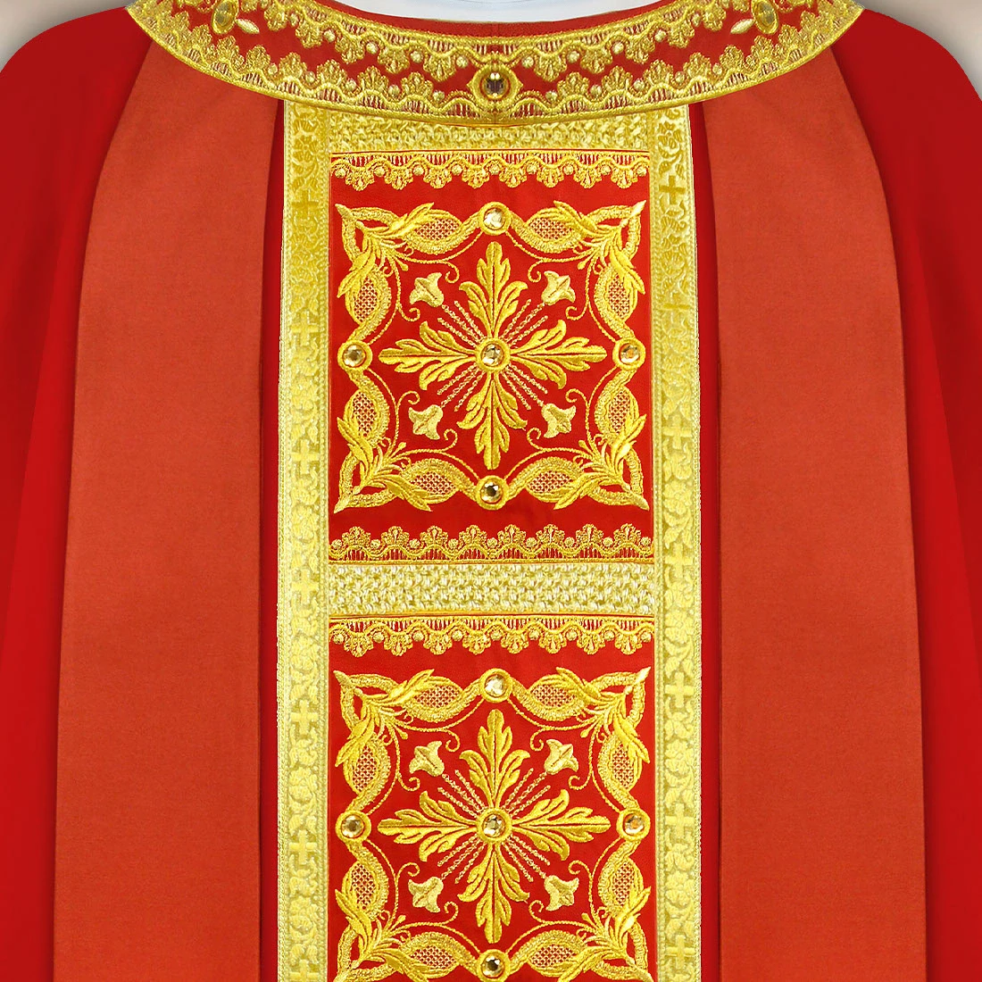 The richly embroidered red liturgical chasuble is a unique priestly vestment designed for solemn celebrations, processions, and liturgies in honor of the holy martyrs and during the Pentecost season. />This model impresses with its elegance, precision of workmanship, and deep liturgical symbolism.